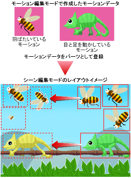 例えば、「羽ばたきする一匹の蜂」のモーションデータを用意し、これをひとつの単位として複数を組合わせ、群生する蜂の集団が動き回るような「シーン」を構成することができるようになります。
