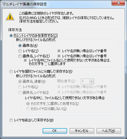 複数のレイヤを持った画像は、複数レイヤ保存に対応していないフォーマットでは、そのままでは複数レイヤを保存することができません。以下から方法を選択して、保存を行います。