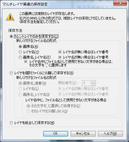 複数のパレット(マルチパレット)を持った画像は、複数パレット保存に対応していないフォーマットでは、そのままでは複数パレットを保存することができません。以下から方法を選択して、保存を行います。