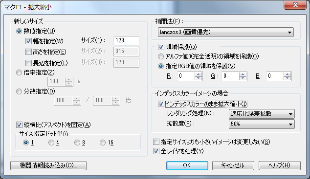 拡大処理のときはlanczos3補間され、使用色数が変化します。 縮小処理のときはlanczos3補間され、使用色数が変化します。 拡大時にジャギーをある程度除去します。 縮小時のディテール劣化が小さく、コントラストの低下も小さいです。 シャープネス効果が強めにかかります。 不自然な輪郭強調が発生することがあります。 人物・風景画など自然画の拡大・縮小に向いています。 処理に非常に時間がかかります。 |