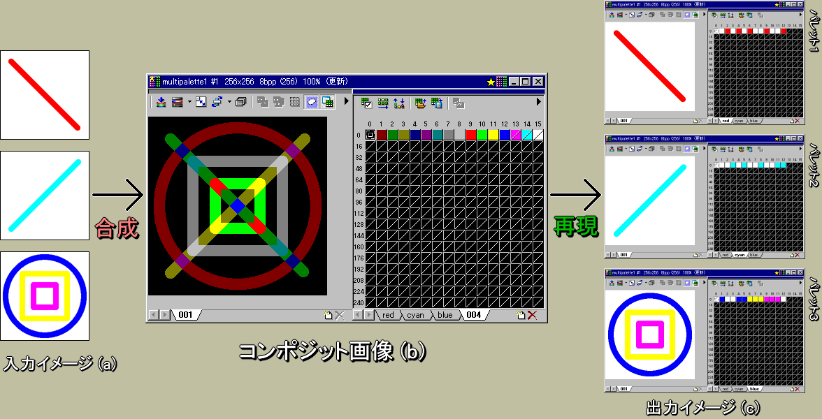 上のコンポジット画像は、左側3枚(a)のイメージを「1枚の16色インデックスカラーイメージと3枚のマルチパレット」になるように合成したものです。