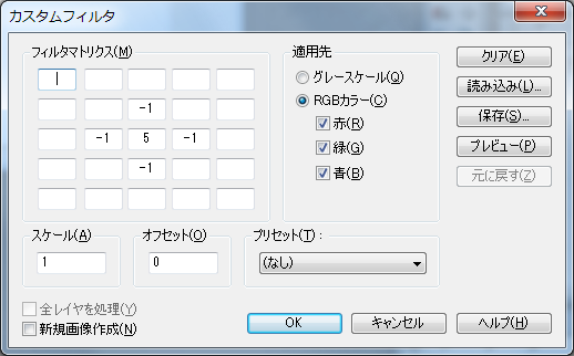 右上ダイアログ画像の設定例では、「対象ピクセルの輝度の49倍」+「周辺ピクセルの輝度の-2倍をすべて足したもの」がまず求められます。この値を[スケール](例では1)で割り、さらに[オフセット](例では0)を足した結果が最終的なピクセルの値になります。