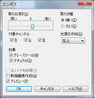 イメージを浮き彫り調にするには、メインメニューから[フィルタ]-[エンボス]を選びます。