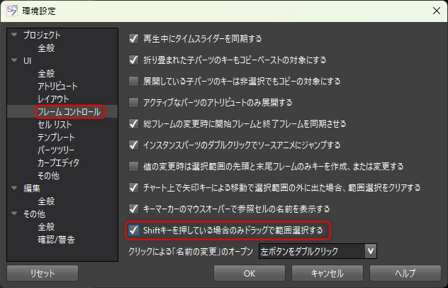 - フレームコントロール:アニメーション再生中に ← → キーを押してもフレーム移動が効かずアニメーションが停止しない。