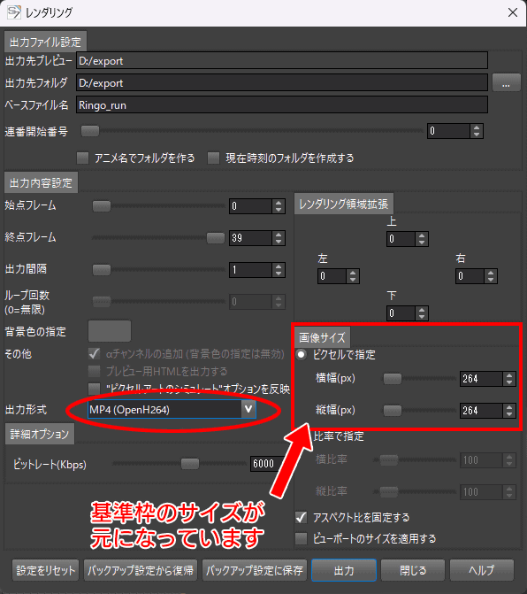 4.出力時の画像サイズを設定します。 ピクセルで指定するか、比率を指定してください。 なお、基準枠を640×640に設定して作成したアニメーションを、320×320に指定して出力した場合、50%に縮小された状態で出力されます。 |