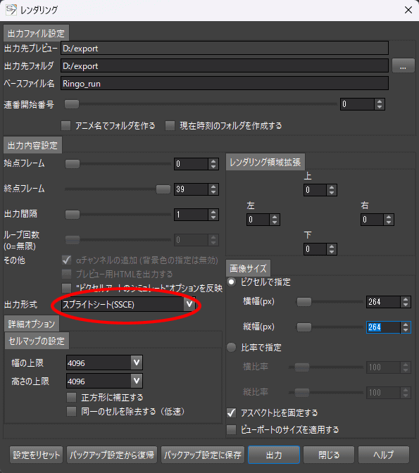 3.「出力形式の変更」欄で「スプライトシート(SSCE)」を選択します。 |