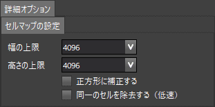 5.「詳細オプション」の「セルマップの設定」で出力した際の画像サイズを指定します。(パターンが多い場合、この設定サイズが小さいとパターンが収まりきらない場合があります) 「正方形に補正する」のチェックをONにすると、上記の設定値が正方形になっていない場合補正します。 「同一のセルを除去する」のチェックをONにした場合は、スプライトシートに収める際、全く同じピクセル情報をもつフレームは画像に収めません。なお、同一チェックを行うので処理に時間がかかります。